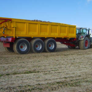Pour assurer le déchargement de vos betteraves, notre remorque ébardeuse traînée est équipée de 2 puissant moteur hydraulique entrainant les 4 chaines de fond d’une capacité de 13T chacune. Une fois la porte hydraulique levée, la vidange express (30 secondes environ) peut démarrer et si vous souhaitez réaliser un tas de plus encore plus haut, il vous suffira